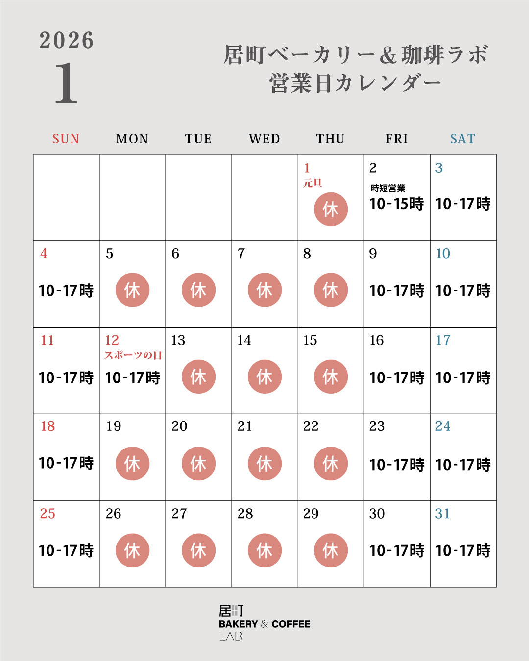 いつもご利用いただきありがとうございます。1月居町ベーカリー&珈琲ラボの営業日になります。
